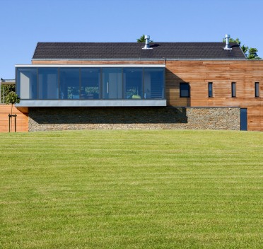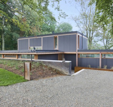Cette habitation s'inscrit dans un terrain très escarpé. Compacte, elle surmonte la voirie et profite de vues dominantes tout en préservant l'intimité des occupants. Les espaces sont fluides et ouverts sur le jardin surélevé, par l'intermédiaire de grandes baies coulissantes, renforçant ainsi la relation décontractée avec les espaces extérieurs.